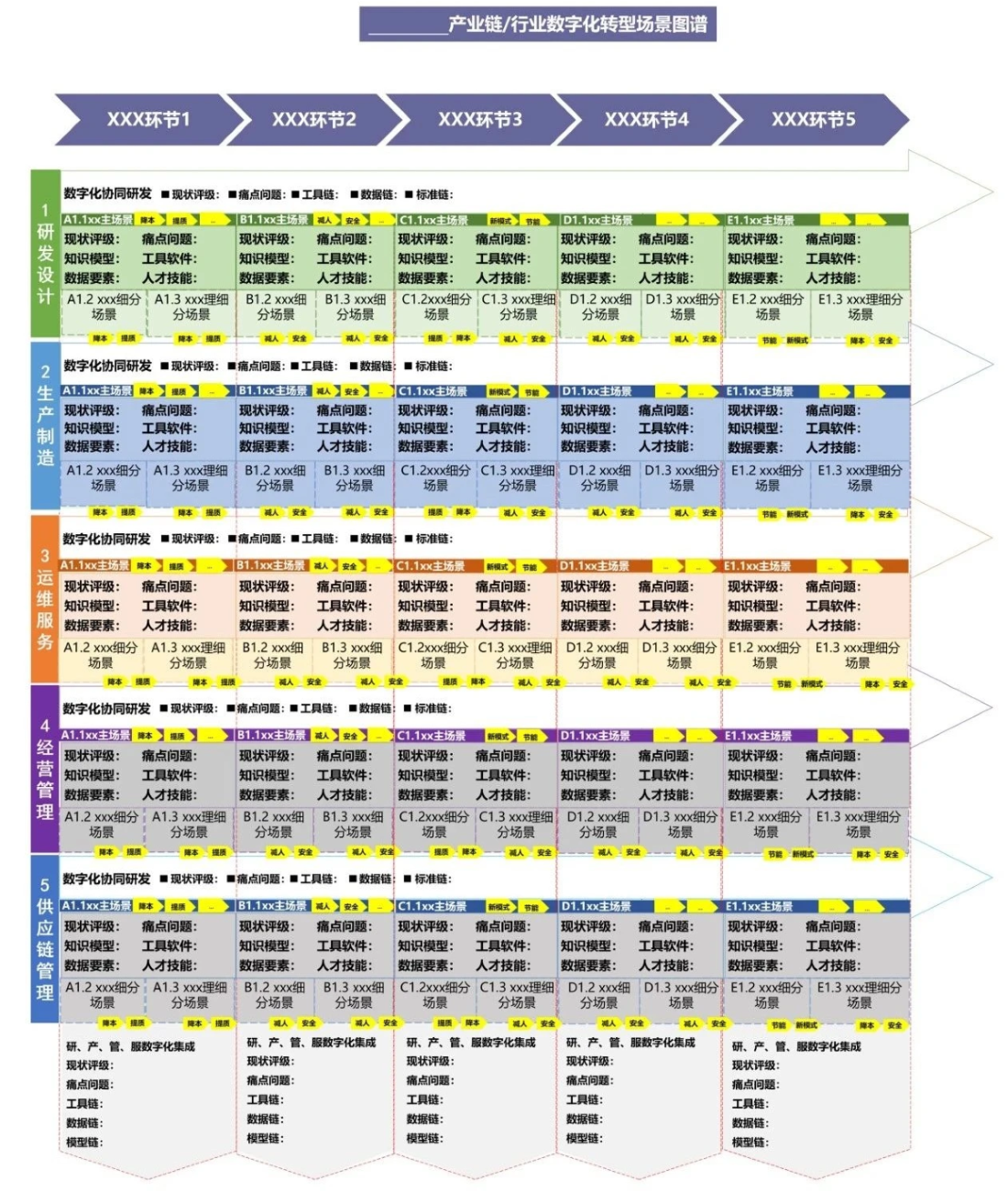 制造業(yè)企業(yè)數(shù)字化轉(zhuǎn)型典型場(chǎng)景參考聚焦產(chǎn)業(yè)鏈上下游企業(yè)研發(fā)設(shè)計(jì)、生產(chǎn)制造、運(yùn)維服務(wù)、經(jīng)營(yíng)管理、供應(yīng)鏈管理等場(chǎng)景,以場(chǎng)景為切入點(diǎn)梳理數(shù)字化轉(zhuǎn)型痛點(diǎn)需求,繪制重點(diǎn)行業(yè)、重點(diǎn)產(chǎn)業(yè)鏈數(shù)字化轉(zhuǎn)型場(chǎng)景圖譜(簡(jiǎn)稱“一圖譜”),明確企業(yè)數(shù)字化轉(zhuǎn)型路徑,促進(jìn)產(chǎn)業(yè)鏈上下游企業(yè)協(xié)同開(kāi)展轉(zhuǎn)型升級(jí)。分場(chǎng)景梳理數(shù)據(jù)要素、知識(shí)模型、工具軟件、人才技能等數(shù)字化轉(zhuǎn)型要素清單(簡(jiǎn)稱“四清單”,合稱“一圖四清單”),助力政產(chǎn)學(xué)研各界聯(lián)合攻堅(jiān)場(chǎng)景數(shù)字化轉(zhuǎn)型關(guān)鍵難點(diǎn)。