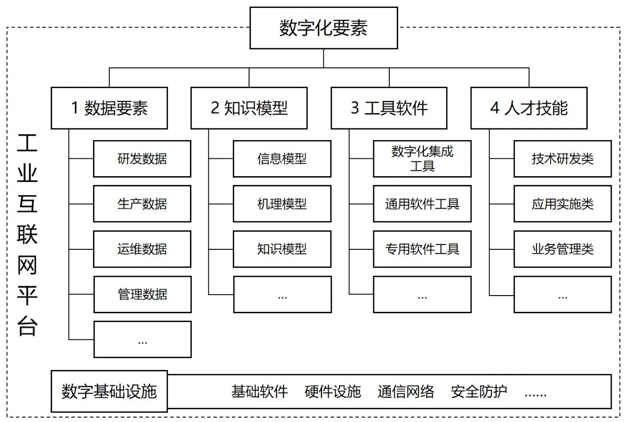 場(chǎng)景的數(shù)字化轉(zhuǎn)型需要相配套的數(shù)字化要素支撐。圍繞場(chǎng)景轉(zhuǎn)型所需的“人、機(jī)、料、法、環(huán)”等資源,將場(chǎng)景數(shù)字化要素劃分為數(shù)據(jù)要素、知識(shí)模型、工具軟件、人才技能等4類要素以及數(shù)字基礎(chǔ)設(shè)施保障(如圖2所示)。