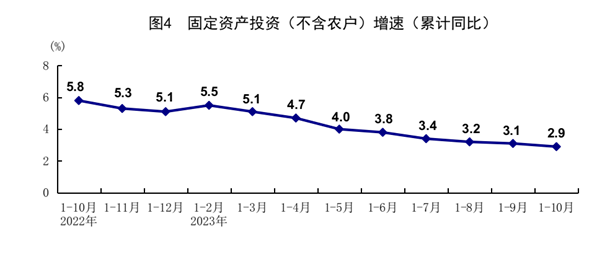 1-10月份,全國(guó)固定資產(chǎn)投資(不含農(nóng)戶(hù))419409億元,同比增長(zhǎng)2.9%,比1-9月份回落0.2個(gè)百分點(diǎn)。分領(lǐng)域看,基礎(chǔ)設(shè)施投資同比增長(zhǎng)5.9%,制造業(yè)投資增長(zhǎng)6.2%,房地產(chǎn)開(kāi)發(fā)投資下降9.3%。全國(guó)商品房銷(xiāo)售面積92579萬(wàn)平方米,同比下降7.8%;商品房銷(xiāo)售額97161億元,下降4.9%。分產(chǎn)業(yè)看,第一產(chǎn)業(yè)投資同比下降1.3%,第二產(chǎn)業(yè)投資增長(zhǎng)9.0%,第三產(chǎn)業(yè)投資增長(zhǎng)0.4%。民間投資下降0.5%,降幅比1-9月份收窄0.1個(gè)百分點(diǎn);扣除房地產(chǎn)開(kāi)發(fā)投資,民間投資同比增長(zhǎng)9.1%。高技術(shù)產(chǎn)業(yè)投資同比增長(zhǎng)11.1%,其中高技術(shù)制造業(yè)和高技術(shù)服務(wù)業(yè)投資分別增長(zhǎng)11.3%、10.5%。高技術(shù)制造業(yè)中,航空、航天器及設(shè)備制造業(yè),醫(yī)療儀器設(shè)備及儀器儀表制造業(yè)投資分別增長(zhǎng)19.0%、16.7%;高技術(shù)服務(wù)業(yè)中,科技成果轉(zhuǎn)化服務(wù)業(yè)、專(zhuān)業(yè)技術(shù)服務(wù)業(yè)投資分別增長(zhǎng)37.3%、29.1%。10月份,固定資產(chǎn)投資(不含農(nóng)戶(hù))環(huán)比增長(zhǎng)0.10%。