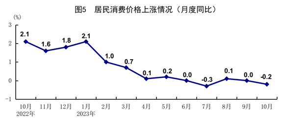 10月份,全國(guó)居民消費(fèi)價(jià)格(CPI)同比下降0.2%,環(huán)比下降0.1%。分類(lèi)別看,食品煙酒價(jià)格同比下降2.1%,衣著價(jià)格上漲1.1%,居住價(jià)格上漲0.3%,生活用品及服務(wù)價(jià)格下降0.6%,交通通信價(jià)格下降0.9%,教育文化娛樂(lè)價(jià)格上漲2.3%,醫(yī)療保健價(jià)格上漲1.3%,其他用品及服務(wù)價(jià)格上漲3.6%。在食品煙酒價(jià)格中,豬肉價(jià)格下降30.1%,鮮菜價(jià)格下降3.8%,糧食價(jià)格上漲0.6%,鮮果價(jià)格上漲2.2%??鄢称泛湍茉磧r(jià)格后的核心CPI同比上漲0.6%。1-10月份,全國(guó)居民消費(fèi)價(jià)格同比上漲0.4%。
